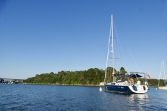 Arriving at our night’s mooring we found the wind blowing across the buoys, the tide pushing firmly from behind and all of the trotts already taken with at least four boats on every set. So, how did it go you may ask…. well, by skilfully identifying the largest boat already secured, and time being the key, we lashed every fender we possessed on the potential collision side and gently landed (controlled crashed) against it (the adjectives used here is still a matter for discussion). I quickly dispensed of the formal greeting of two opposing kisses with the skipper as, like a slightly overweight gazelle I ran across the back of this boat and grabbed the rear buoy as did my athletic and nimble wife at the front. The down side was that there was a hideous, indescribable mess of ropes, lines and general knots already on these buoys leading to the other boats.